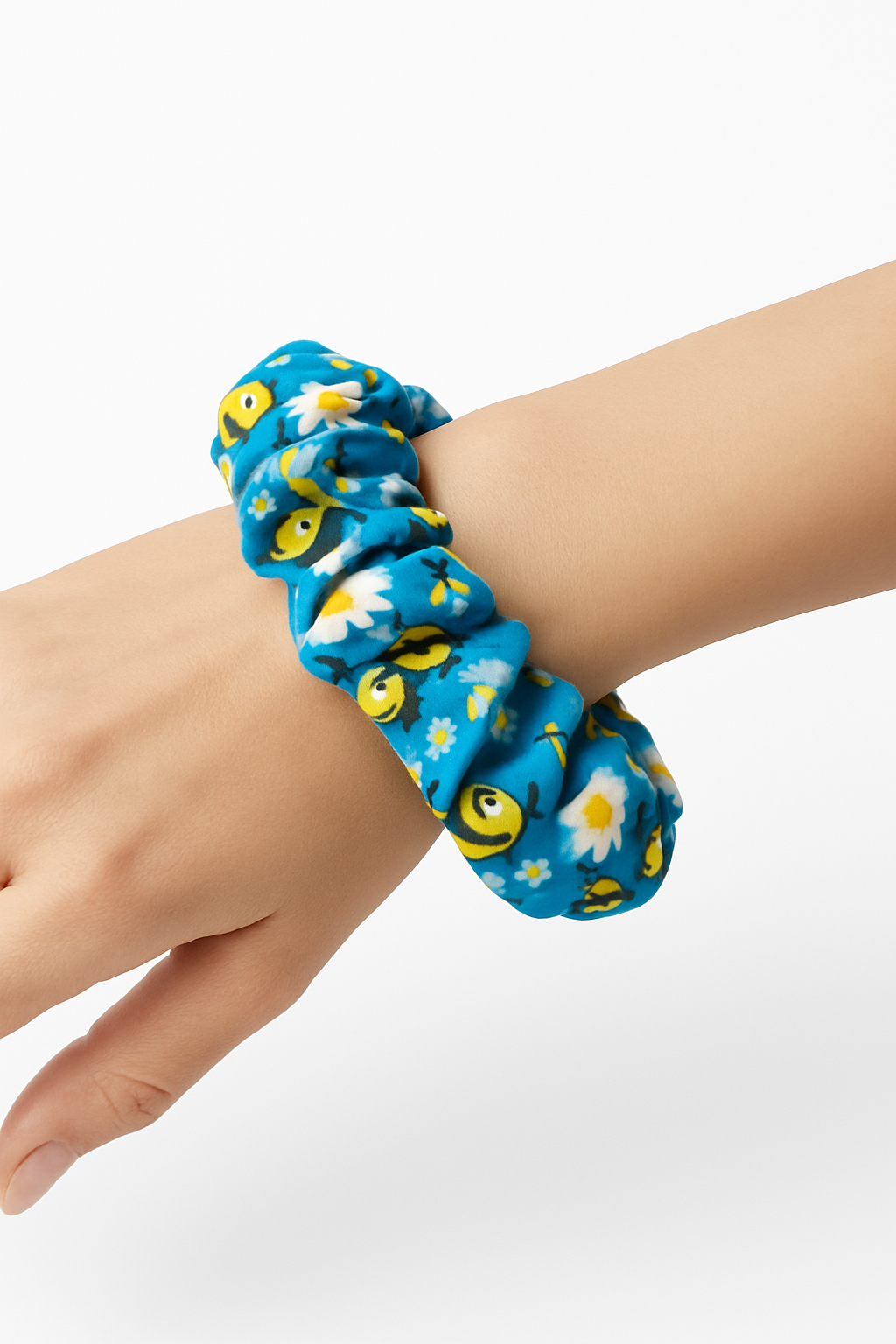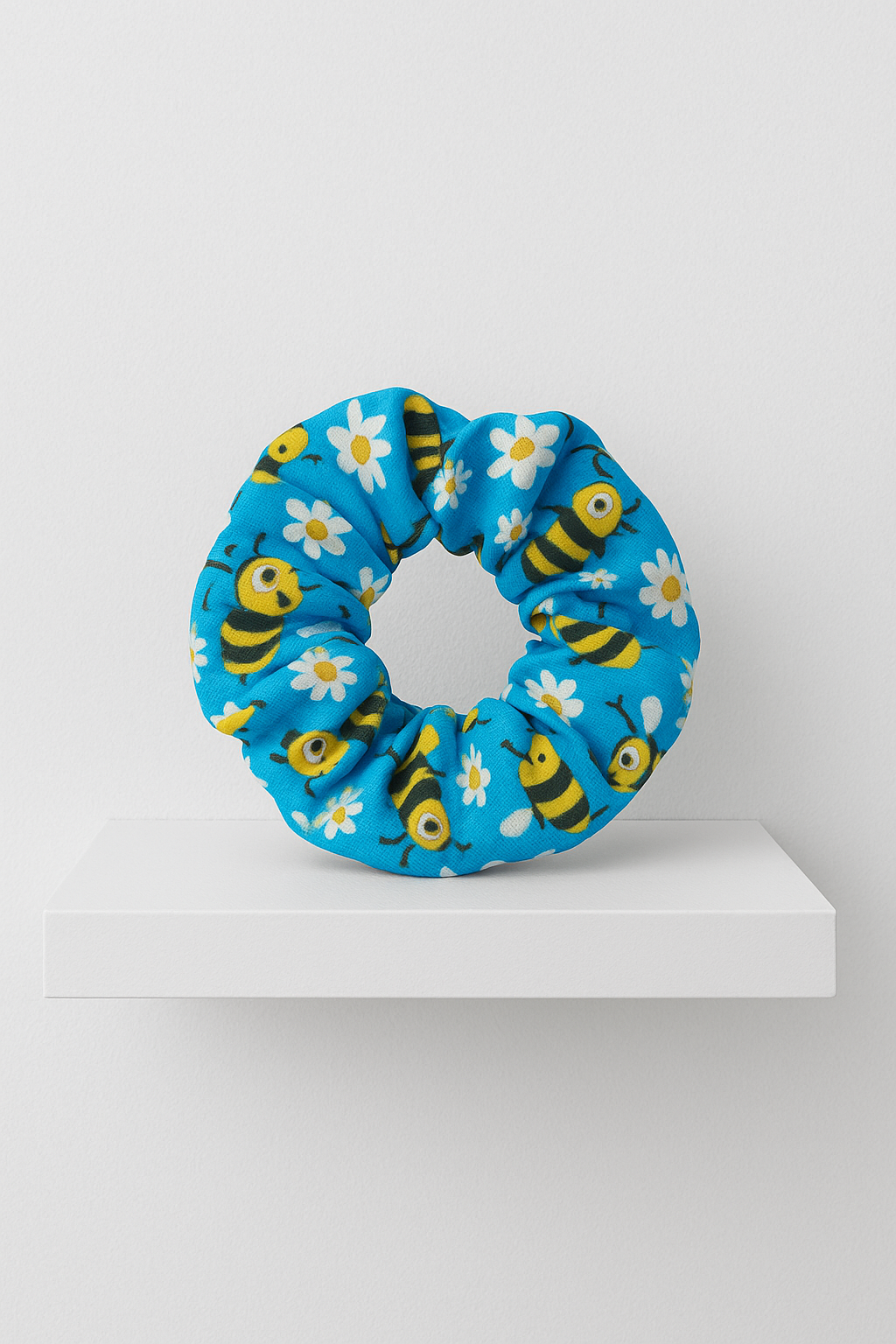 The vibrant blue background with cheerful bees makes this scrunchie a standout accessory—fun, fresh, and versatile enough to wear with any outfit.