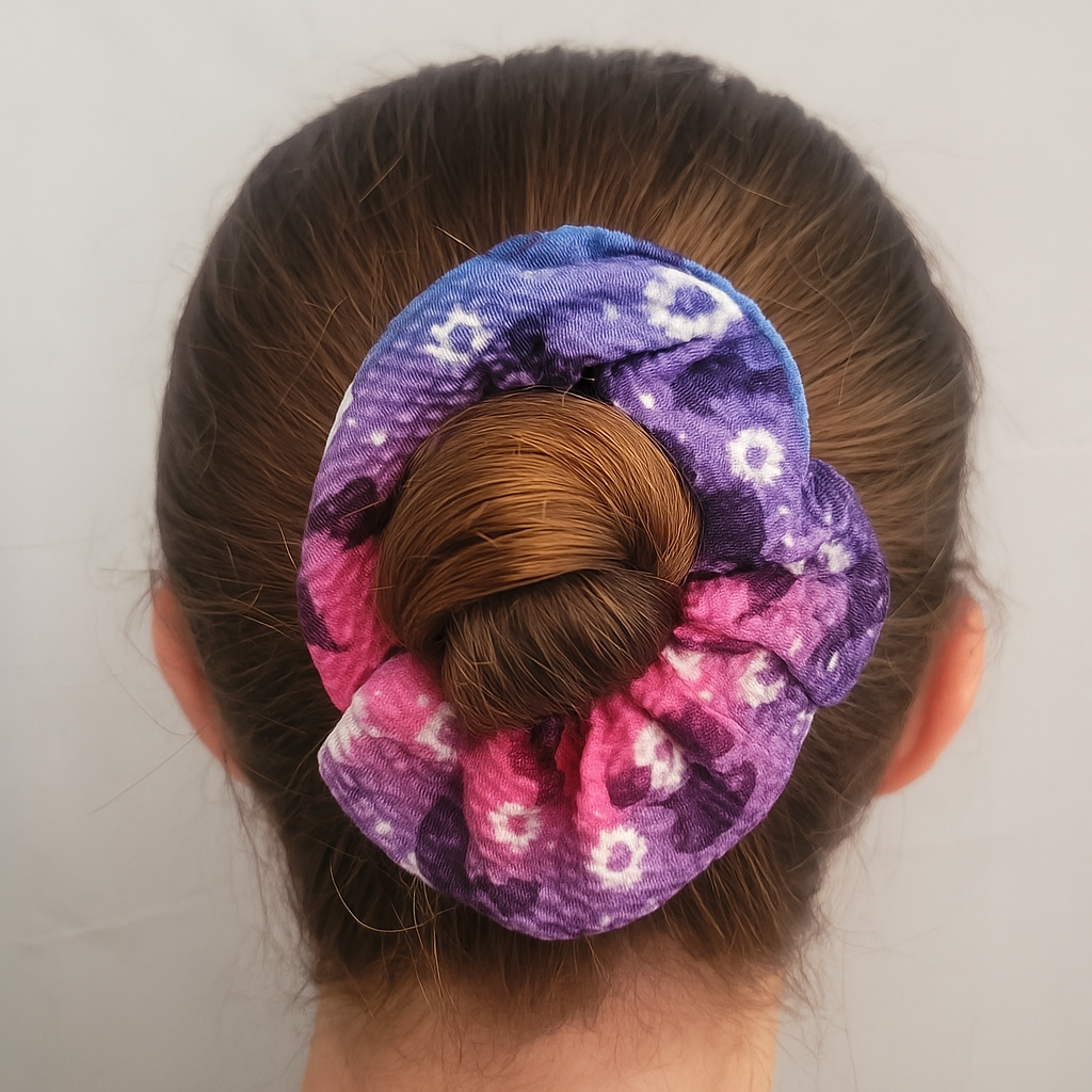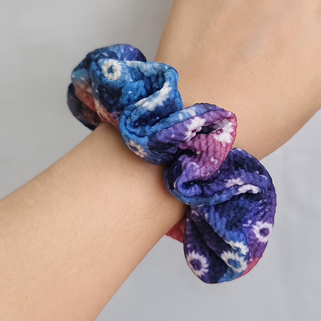 Brighten up your hairstyle with this vibrant tie-dye floral scrunchie. Featuring a blend of pink, purple, and blue tones with subtle flower details, this soft and stretchy hair tie adds a bold, stylish touch to any look. Perfect for ponytails, messy buns, or wearing on your wrist, it offers a comfortable hold without pulling. A…