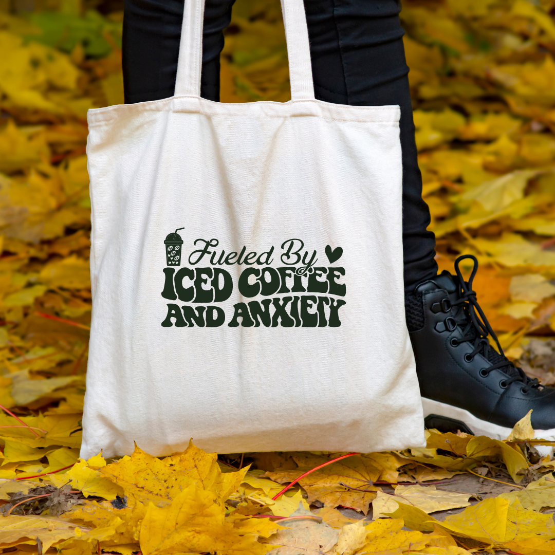 Fueled by Iced Coffee & Anxiety Tote Bag – funny reusable canvas bag for coffee lovers. Perfect gift, everyday shopping tote, or stylish carry-all.