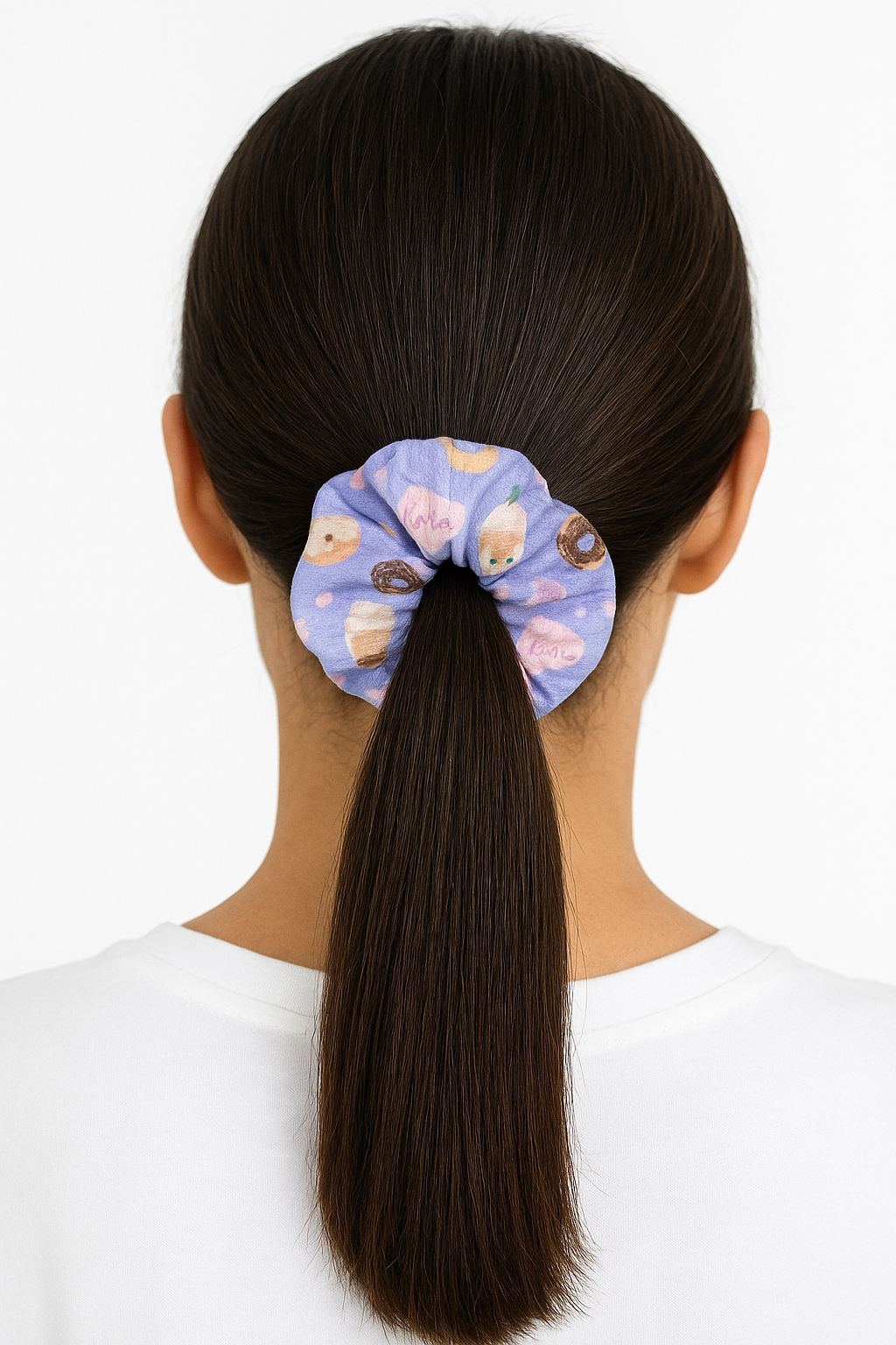 Start your day with cozy vibes and cute style! This scrunchie features a fun donut and coffee print on a purple background – perfect for every foodie and caffeine lover. Soft, stretchy, and gentle on your hair, it keeps your ponytail or bun secure without breakage.