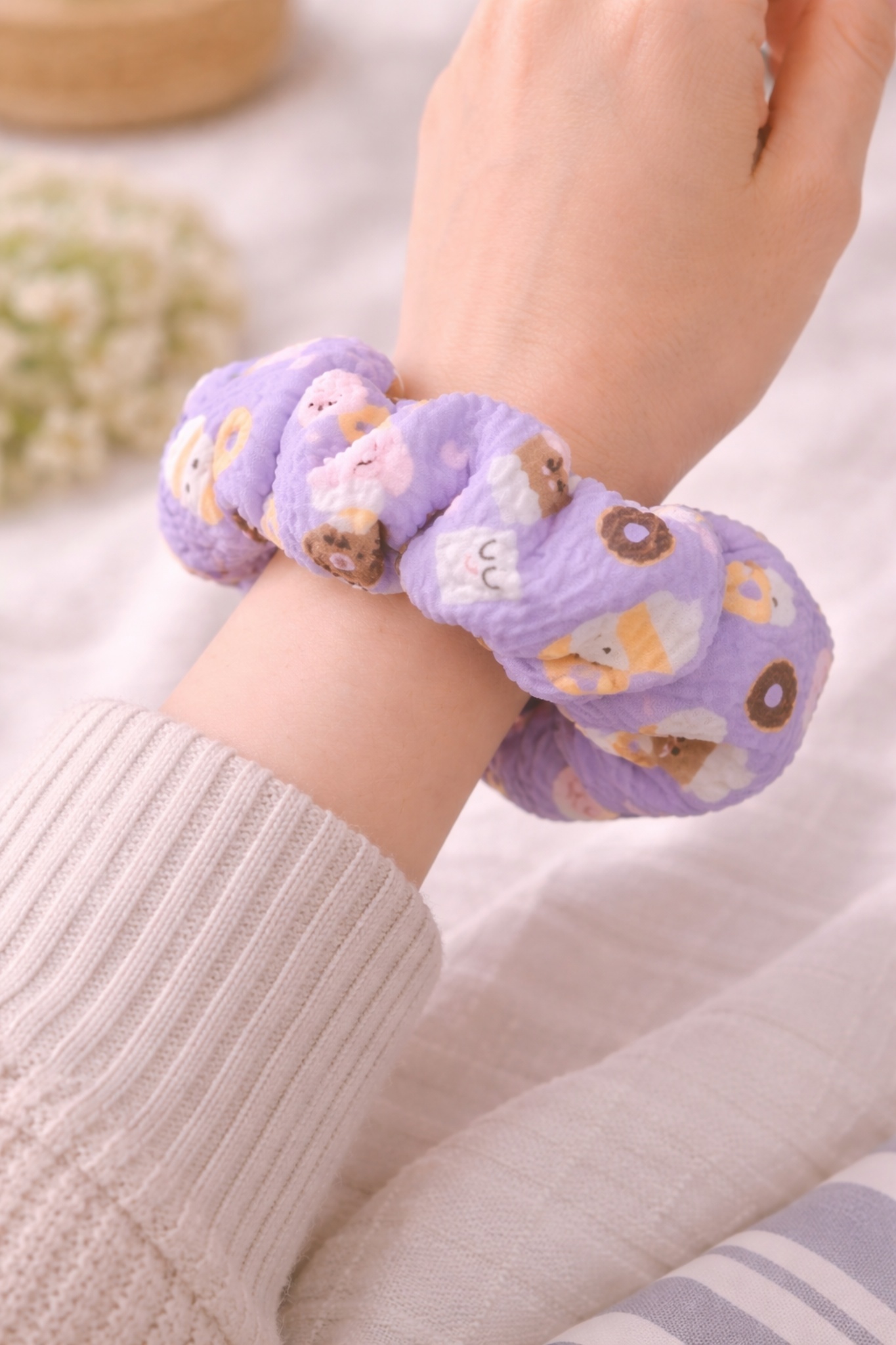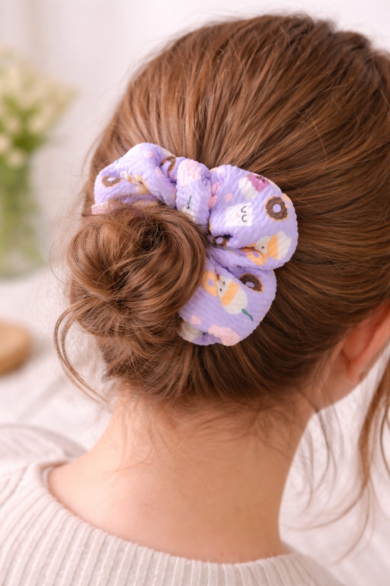 Whether you’re heading out for a coffee run, lounging at home, or adding a pop of personality to your outfit, this scrunchie is the sweetest accessory you’ll own.